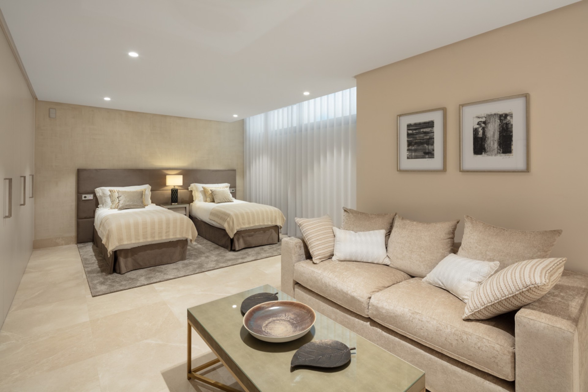 Das Innere der Villa zeichnet sich durch ein offenes Design aus, mit einer neutralen Farbpalette, die durch warme Details ergänzt wird. Das Wohnzimmer, das Esszimmer und die Küche sind sowohl funktional als auch ästhetisch gestaltet. Die Küche verfügt über eine geräumige Insel und einen schwebenden Esstisch, der eine vielseitige Umgebung zum Kochen und Teilen bietet. Die Schlafzimmer sind luxuriös und komfortabel, wobei das Hauptschlafzimmer im Mittelpunkt steht und einen atemberaubenden Blick, Zugang zur oberen Terrasse und einen exklusiven Ankleideraum für Schmuck und Accessoires bietet. Das Hauptbadezimmer verfügt über beruhigenden Marmor, einen doppelten Waschtisch, eine begehbare Dusche und eine Badewanne mit Blick auf die Aussicht. Das Haus verfügt über ein Home-Office, um die Arbeit zu erleichtern, ein Spa mit Sauna und türkischem Bad zur Entspannung und einen spektakulären Unterhaltungsraum mit Heimkino, Billardtisch und einer eigenen Bar mit Weinkühlern. Diese Räume sind so konzipiert, dass sie Momente der Freizeit und des Genusses in einer luxuriösen Umgebung bieten.