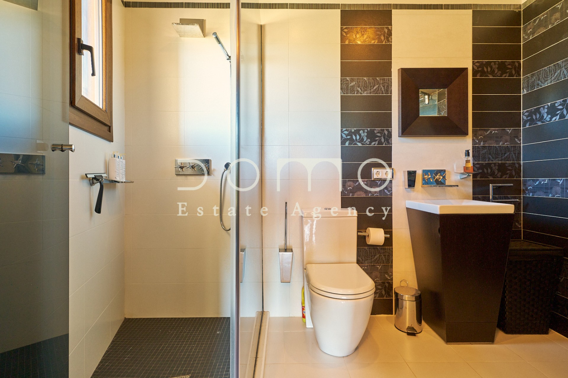 Desde el patio interior, una sólida puerta de madera conduce a una luminosa sala de estar abierta con chimenea, suelo de mármol y puertas que dan acceso a las terrazas. A la izquierda hay un elegante despacho con acceso directo a la piscina, mientras que el aseo de invitados se encuentra convenientemente situado junto al pasillo principal.