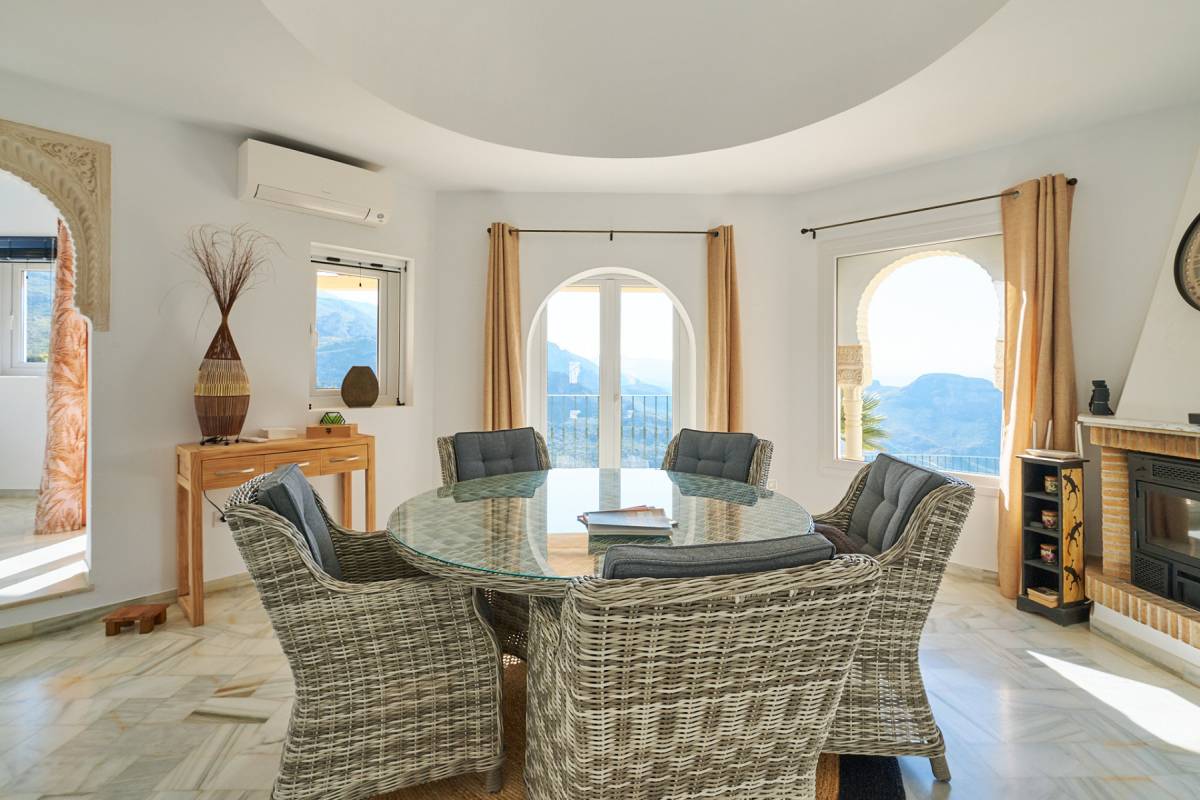 From the terraces, the pool, or even inside the house, the landscape opens completely towards the mountains—no obstacles, no buildings interrupting the view.