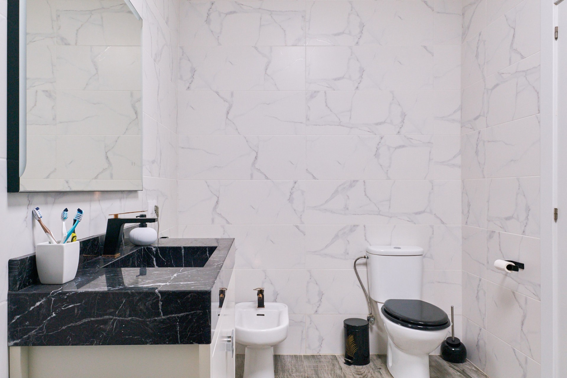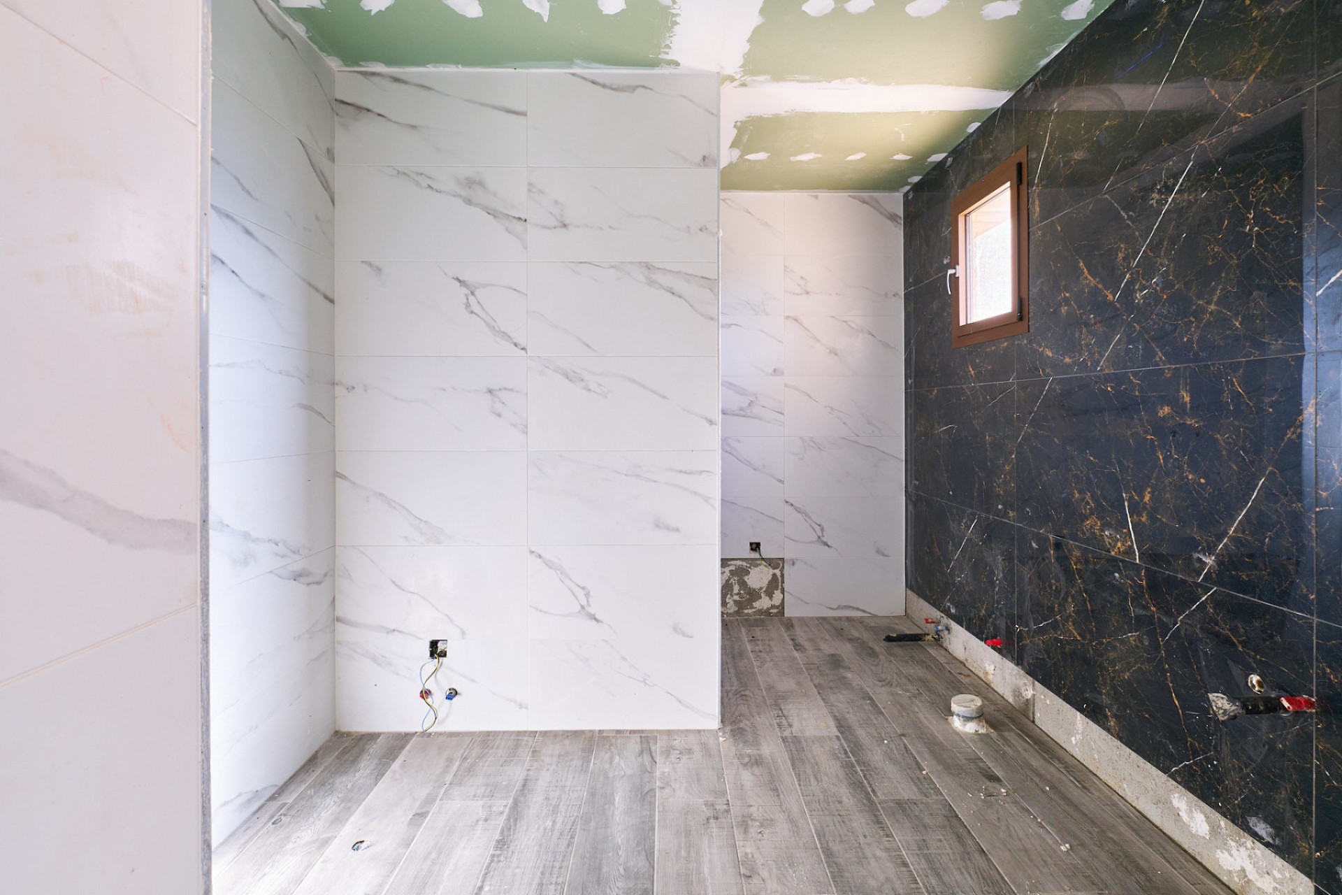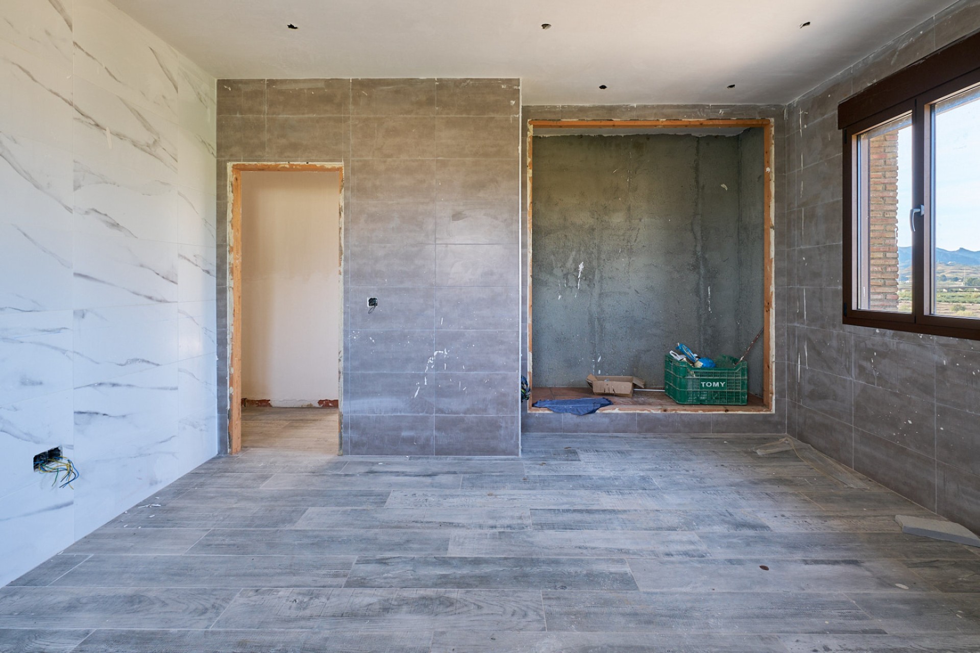 Vanaf deze verdieping heeft men via een trap toegang tot de bovenverdieping, hoewel de doorgang momenteel is afgesloten. Op deze verdieping bevindt zich het hoofdgedeelte van de woning, dat bestaat uit drie slaapkamers, twee badkamers, een keuken en een woonkamer. Dit deel van het huis is half afgewerkt, waarbij alle elektrische en sanitaire voorzieningen al zijn geïnstalleerd, zodat het naar de smaak van de nieuwe eigenaar kan worden afgewerkt.