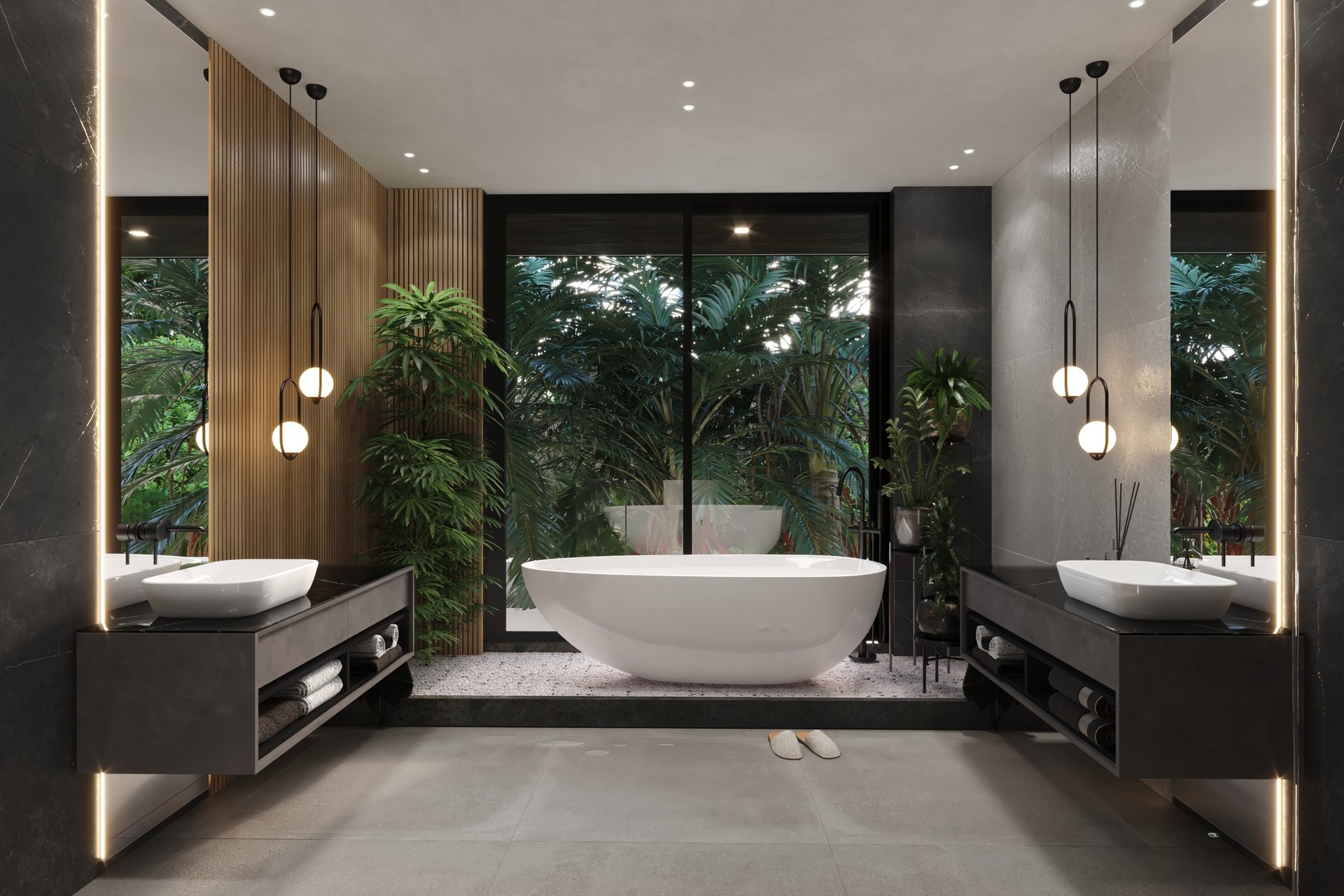 The interior of each villa is designed for maximum comfort and luxury. On the first floor, an open-plan kitchen connects effortlessly with the living room, creating a spacious and bright space that extends out onto the outdoor terraces. The upper floor houses a master suite with private gallery, plus three additional bedrooms, all with en-suite bathrooms, ensuring privacy and space for the whole family. The basement offers a multiple living room with bar and home theater, along with additional bedrooms, all accessible via a private elevator. Interior finishes include porcelain tile and parquet floors, LED lighting systems, and underfloor heating, ensuring a sophisticated and comfortable living experience.